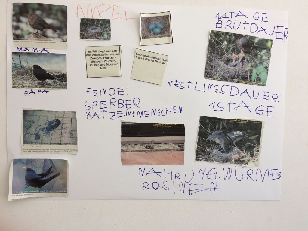Das eine oder andere Kind berichtete seinen Eltern bereits davon: „Wir haben ein Amselnest im Garten…“ – und tatsächlich: Im Schuppen über dem Standort der Schubkarre ist ein Nest zu finden, in dem vier der typischen grünen Amseleier liegen. Kurzerhand wurde nun ein Teil des Gartens zum Amselschutzgebiet erklärt und entsprechend gesichert und abgesperrt. Und da so ein aufregendes Ereignis weitere Beschäftigung mit dem Thema ja geradezu provoziert, gestalteten die Kinder auch gleich eine Wandzeitung mit allerlei interessanten Informationen über Amseln, ihre Brut- und Nistzeit und weitere Fakten, die sicher auch für die Mamas und Papas noch neue Informationen bereithält. Ein tolles Beispiel für praktisches und lebendiges Lernen im Sinne von Maria Montessori!