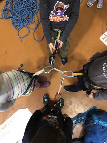 In der großen Halle üben sich alle beim Sichern und Knoten binden.
